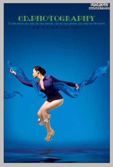 3:調(diào)整皮膚色彩、服裝的色彩,主要用可調(diào)整圖層,然后加上背景素材、倒影等,注意腳背往下繃一點是用自由變換的變形調(diào)整滴