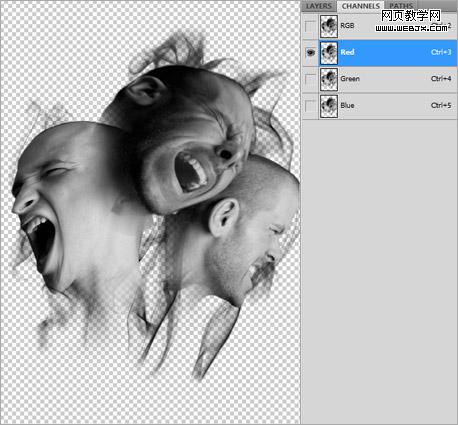 這時(shí)隱藏其它所有圖層,僅顯示頭部和煙霧圖層,然后切換到通道面板,選擇紅色通道。