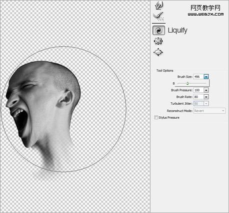 我們選擇head 1圖層,執(zhí)行液化濾鏡,選擇twirl clockwise tool 工具將沿順時(shí)針方向扭曲圖像,設(shè)置筆刷大小為495,壓力設(shè)置100,其它選擇默認(rèn),用畫筆繪制人物頭部。