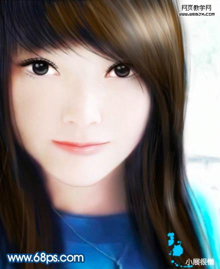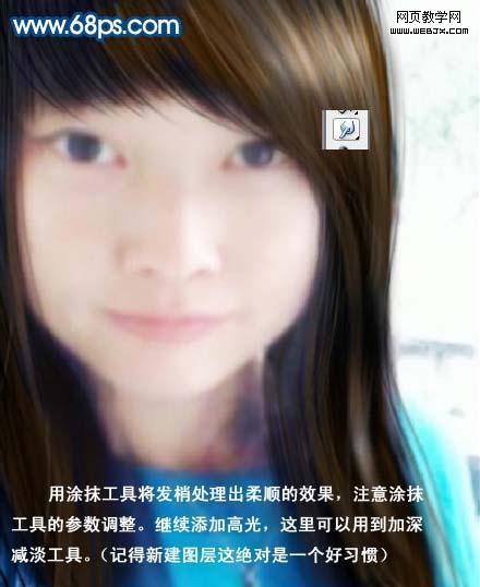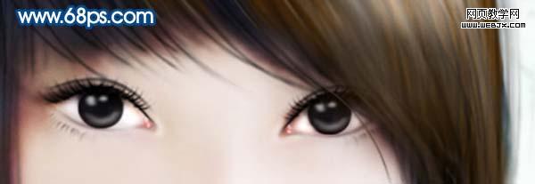 5、用涂抹工具將發(fā)梢處理出柔順的效果,注意涂抹工具參數(shù)調(diào)整。繼續(xù)添加高光,這里可以用到加深/減淡工具。(記得新建圖層這樣絕對是一個號習(xí)慣)。 6、用鋼筆工具沿著眼睛的輪廓仔細勾畫,尤其注意下眼瞼和眼膠內(nèi)的結(jié)構(gòu)。