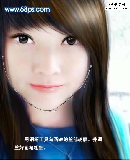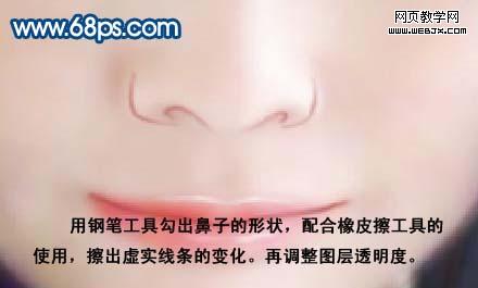10、用鋼筆工具勾畫人物臉部輪廓,并調(diào)整好畫筆粗細。 11、新建一層,用比皮膚深的顏色勾畫臉部輪廓,注意調(diào)整圖層透明度。 12、用鋼筆工具勾出鼻子的形狀,配合橡皮擦工具的使用,擦出虛實線條的變化,再調(diào)整圖層不透明度。