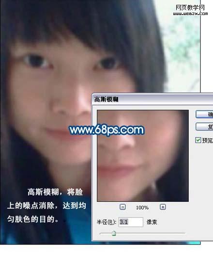 1、打開原圖素材,把背景圖層復(fù)制一層,執(zhí)行:濾鏡 > 模糊 > 高斯模糊,數(shù)值為3.1,達到均勻膚色的目的。 |