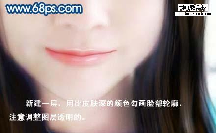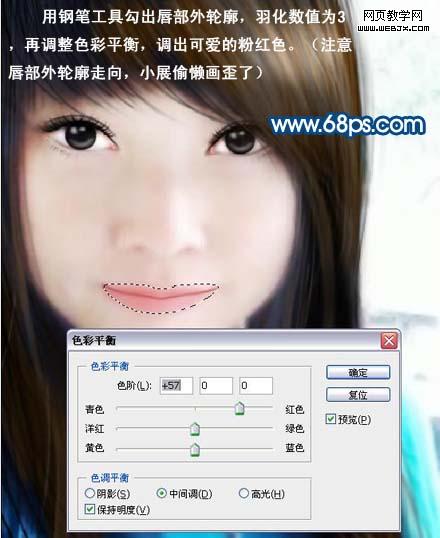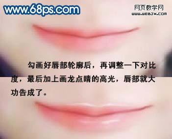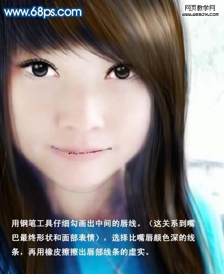 7、用鋼筆工具仔細勾畫出中間的唇線。(這關(guān)系到嘴巴最終形態(tài)和面部表情)。選擇比嘴唇顏色深的線條,再用橡皮擦擦出唇部線條的虛實。 8、用鋼筆工具勾出唇部外輪廓,羽化3個像素,再按ctrl + b 調(diào)整色彩平衡,調(diào)出可愛的粉紅色。(注意唇部外輪廓走向)。 9、勾畫好唇部輪廓后,再調(diào)整一下對比度,最后加上高光,唇部就大功告成。