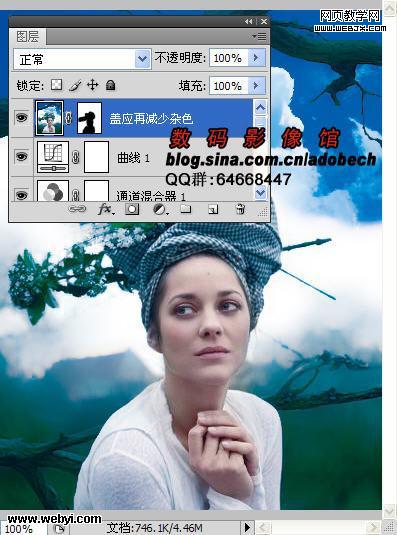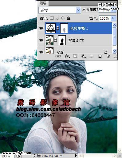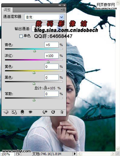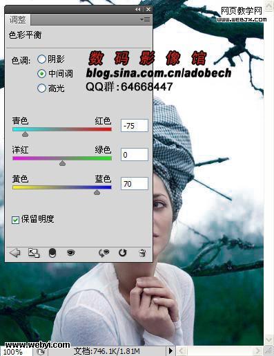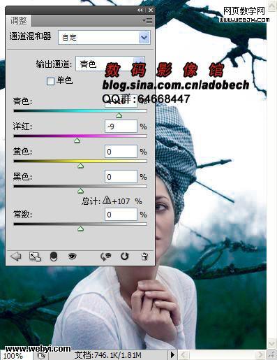 4、創(chuàng)建色彩平衡調(diào)整圖層,參數(shù)設(shè)置如下圖。 5、使用50%黑色畫筆涂抹人物臉部位置。 6、創(chuàng)建通道混合器調(diào)整圖層,參數(shù)設(shè)置如下圖。