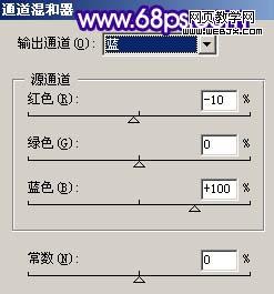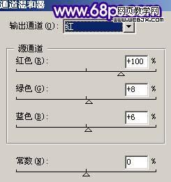 2、創建通道混合器調整圖層,對紅色及藍色進行調整,參數設置如圖5,6,效果如圖7。