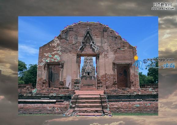 <圖9> 6、選擇鋼筆工具,在工具條上選擇路徑按鈕,在素材3上繪制如圖10所示路徑,按ctrl+enter鍵將路徑轉換為選區,并單擊添加圖層蒙版按鈕為“圖層2”添加圖層蒙版得到如圖11所示效果。