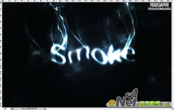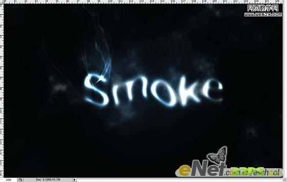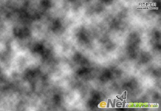 5、執(zhí)行【濾鏡—模糊—高斯模糊】命令,模糊半徑為10像素。 6、點(diǎn)擊圖層調(diào)板下方的【創(chuàng)建新組】按鈕,新建一個(gè)組,然后將其重命名為【文字】,把剛才新建的文字圖層拖入組【文字】中,并將組【文字】的混合模式改為【顏色減淡】效果如下圖所示。 7、在所有圖層的上面新建一層,命名為【云】。確認(rèn)前景色為白色,背景色為黑色,執(zhí)行【濾鏡—渲染—云彩】命令,效果如下圖所示。