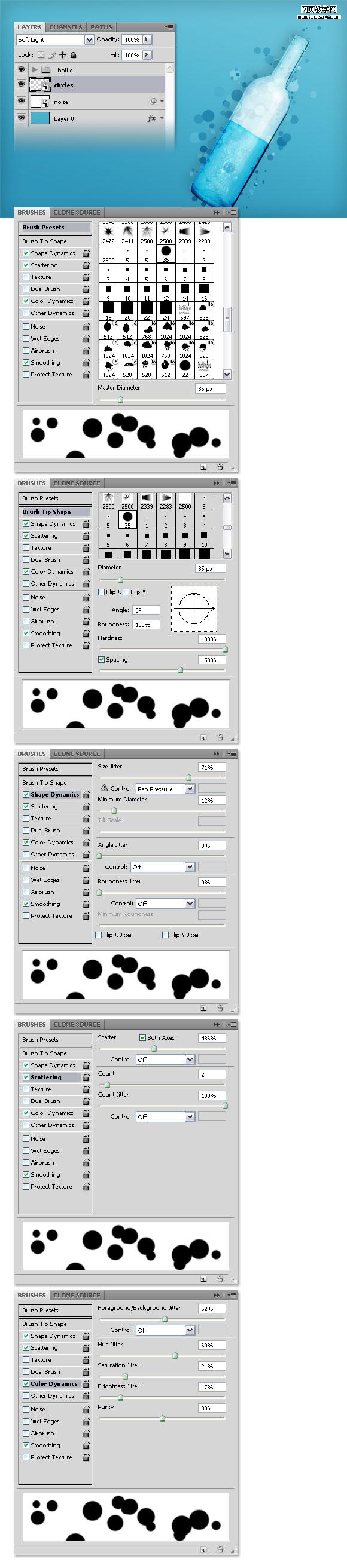 之后我們創(chuàng)建一個(gè)新圖層,設(shè)置瓶子周圍的一些特效,設(shè)置畫筆如下,然后繪制,最后把圖層模式設(shè)置為柔光,圖層命名為circles。