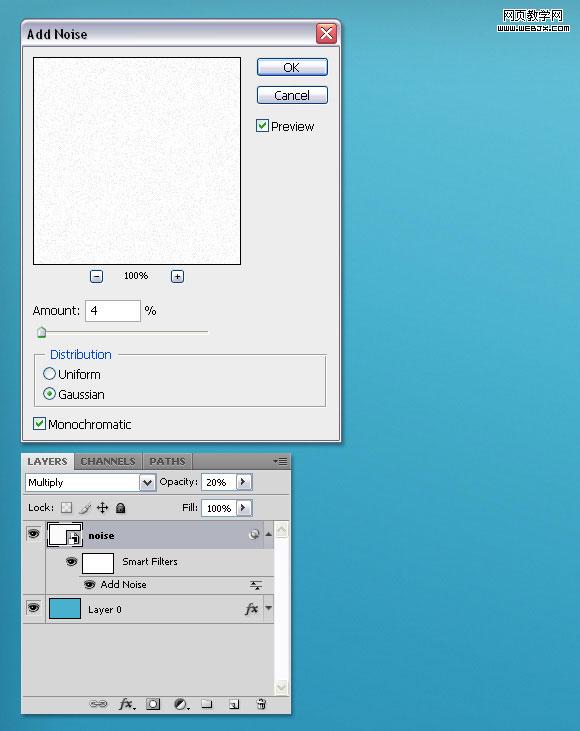 新建立一個(gè)圖層,然后填充為白色,右擊圖層選擇裝換為smart object(智慧工具),然后添加則色,之后設(shè)置圖層模式為正片疊底模式,不透明度設(shè)置為20%,把該圖層命名為noise。