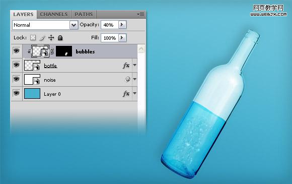 然后我們添加蒙板,然后執(zhí)行圖層-圖層蒙板-隱藏所有,我們用白色的畫筆繪制水的光線,把圖層不透明度設(shè)置為40%,命名為bubbles。