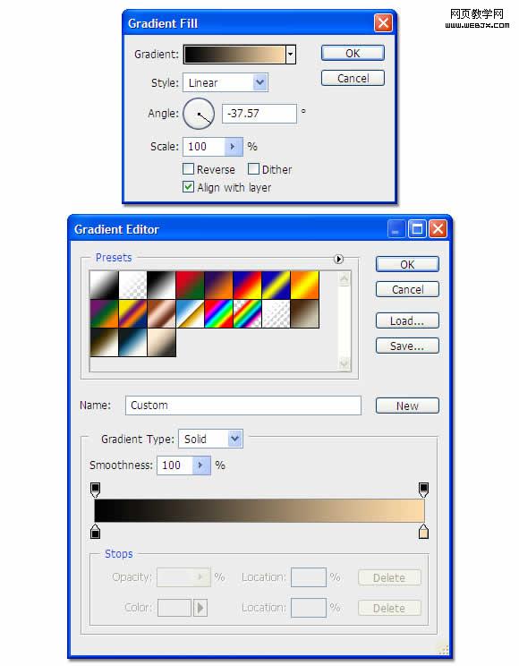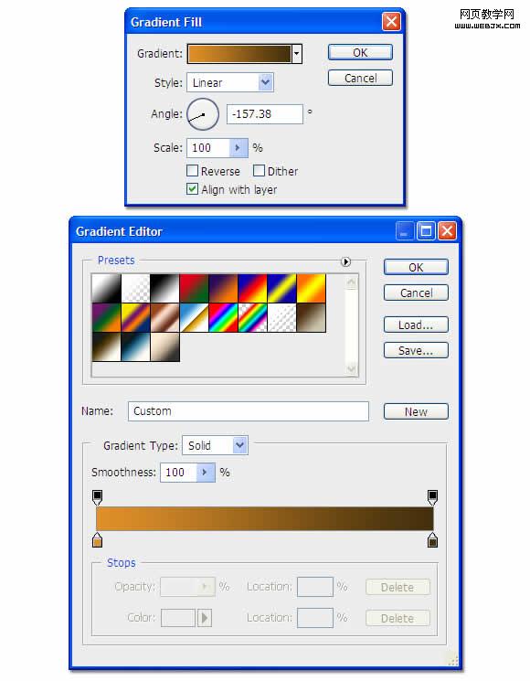 第15步:新建立一個漸變填充圖冊,設置如下,顏色從 #e09028到 #442f0a。