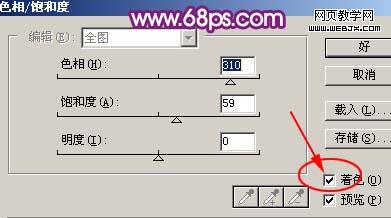 2、創建色相/飽和度調整圖層,參數設置如圖2,勾選著色選項,效果如圖3。