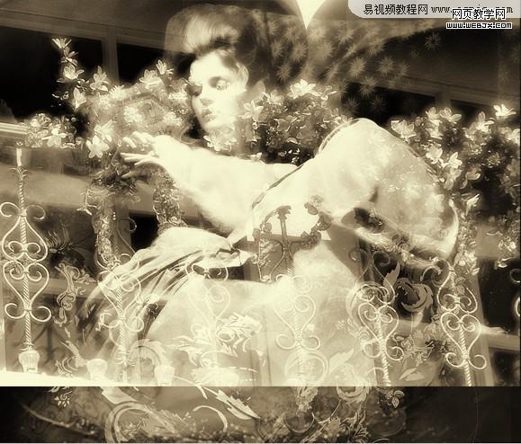 11、給“圖層4”添加圖層蒙版并涂抹,將與人物重疊的花隱藏起來,直至得到如圖16所示效果,此時蒙版中的狀態如圖17所示。