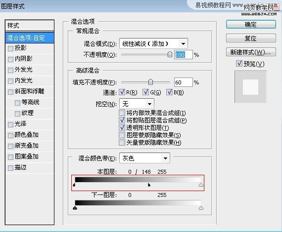 8、下面來對花紋圖像進行細節的調整處理。雙擊“圖層3”的縮覽圖以調出“混合選項”對話框,在底部“混合顏色帶”區域中,按住alt鍵拖動右半個三角滑塊,如圖11所示,從而去除圖像中的部分黑色像素,得到如圖12所示效果。