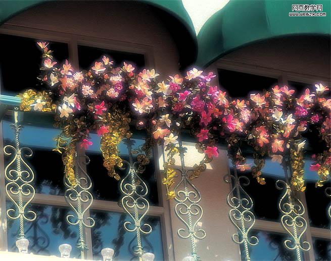 10、下面來添加另外的花朵圖像。顯示“素材4”并將其重命名為“圖層4”,拖至“漸變映射1”下方并設置其混合模式為“濾色”,得到如圖15所示效果。