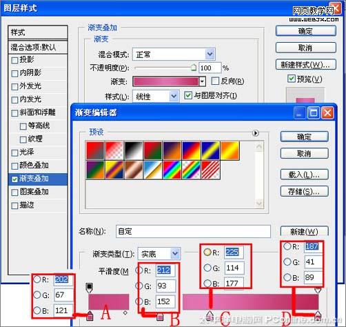 3、點擊圖層樣式,勾選漸變疊加,彈出漸變疊加對話框,設置漸變彈出漸變編輯器,在漸變編輯器設置rgb值:在a處設置rgb值分別為216、95、175,在b處設置rgb值分別為216、95、175,在c處設置rgb值分別為216、95、175,在d處設置rgb值分別為241、193、223,接著點擊確定按鈕,如圖3所示。效果如圖4所示。