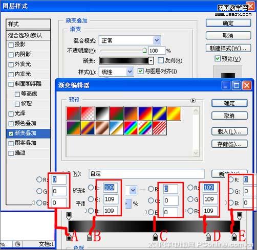 14、選中瓶口圖層,點擊圖層樣式,勾選漸變疊加,彈出漸變疊加對話框,設置漸變彈出漸變編輯器,在漸變編輯器設置rgb值:在a處設置rgb值分別為0、0、0,在b處設置rgb值分別為109、109、109,在c處設置rgb值分別為0、0、0,在d處設置rgb值分別為109、109、109,在e處設置rgb值分別為0、0、0,接著點擊確定按鈕,如圖17所示。效果如圖18所示。