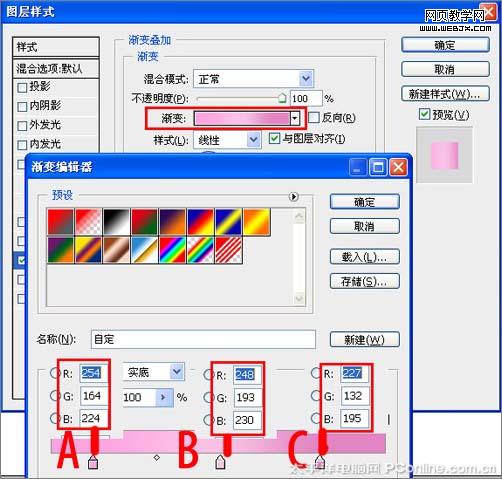 6、選中圖層2,點擊圖層樣式,勾選漸變疊加,彈出漸變疊加對話框,設置漸變彈出漸變編輯器,在漸變編輯器設置rgb值:在a處設置rgb值分別為254、164、224,在b處設置rgb值分別為248、193、230,在c處設置rgb值分別為227、132、195,接著點擊確定按鈕,如圖7所示。效果如圖8所示。