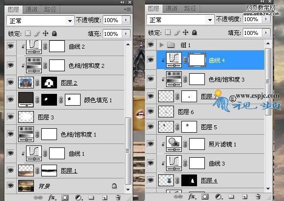 7、按照第3步的方法,對素材3圖像進行“色相/飽和度”及“曲線”調整,并設置其對話框分別如圖12和圖13所示,得到如圖14所示效果。