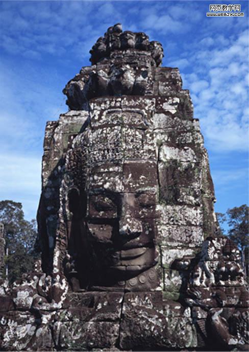 12、選擇“曲線2”,打開“素材4”如圖21所示。用移動工具拖到文件中,得到圖層4.結合自由變換控制框調整圖像大小及位置,效果如圖22所示。按照第6步的方法使用鋼筆工具將佛的頭部勾畫出來,轉換成選取,添加圖層蒙版得到如圖23所示。