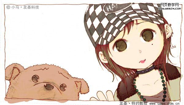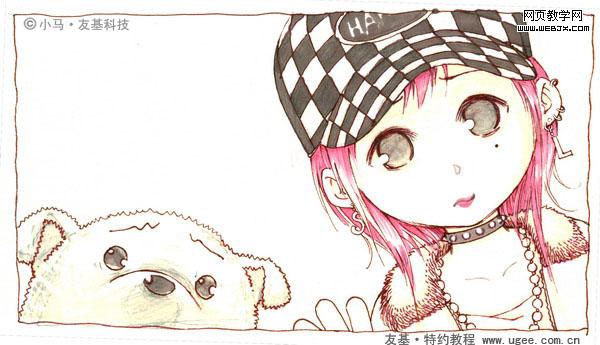 1.這次將繪制一個女孩和她的寵物旺旺在拍照時的情形,用比較常規的卡通繪制手法來實現,構圖選在按下快門前的那一刻:)首先,是在a4的紙上快速的勾出線稿,然后用紅色的中性筆描線,而且用馬克筆鋪了一些基礎的色塊,如帽子,頭發等,同時再用比較淺的明黃色馬克筆根據光照方向切了一下人物和寵物的暗部,只要有一點就可以了,這些顏色和隨意的線條,在掃描進電腦里處理的時候都將是保留到最后的。