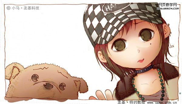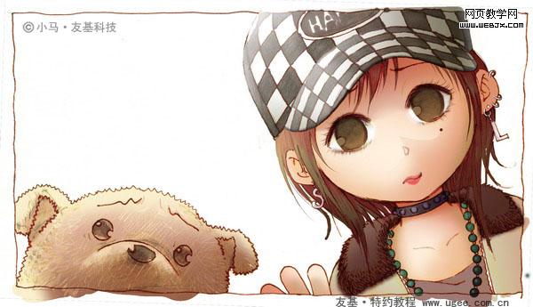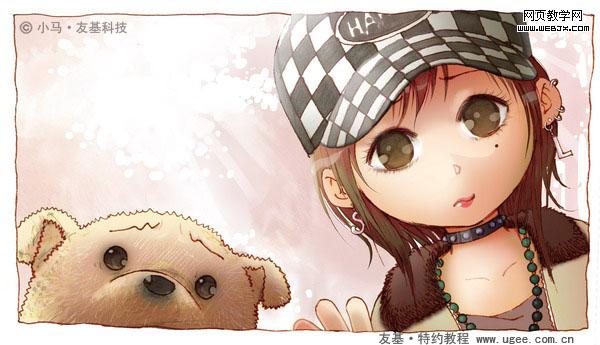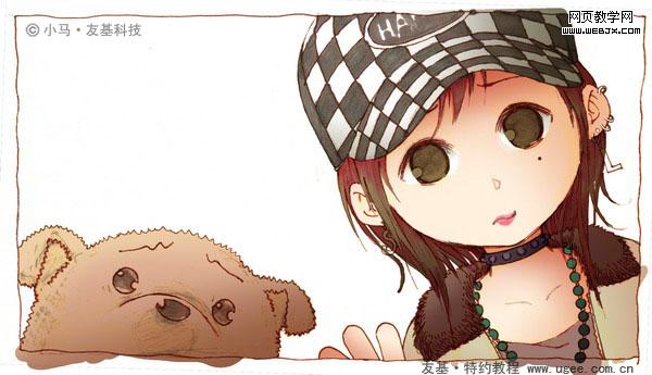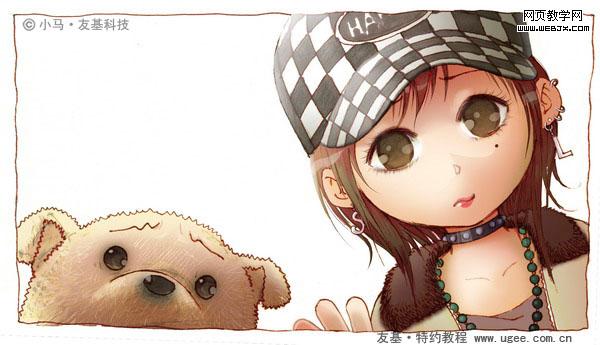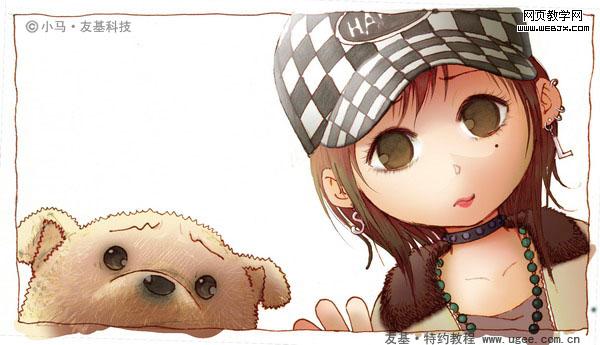 5.現在開始畫對象的亮面,新建立一個正常層,將軟噴頭的畫筆調得稍微大一些,用白色在帽子和頭發的地方輕輕的噴兩下,人物的亮面光感差不多后,把畫筆調小,將人物的面部細節刻畫一下,如頭發的細節,眼睫毛等,同時將寵物的亮面也刻畫一下,為了表現一種毛茸茸的感覺,下筆的時候可以隨意一些,友基數位板1024級的壓感可以很輕松地畫出想要的效果,如下圖: