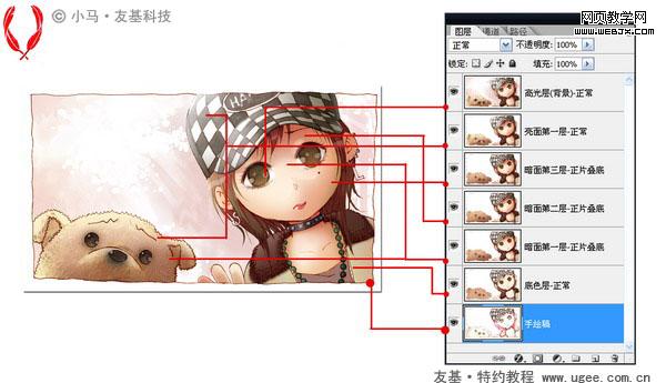 9.這張圖中用到的畫筆就是ps里自帶的畫筆,只需在適當的時候調整硬度和透明度就可以了,其次就是圖層的使用,可參考下圖。