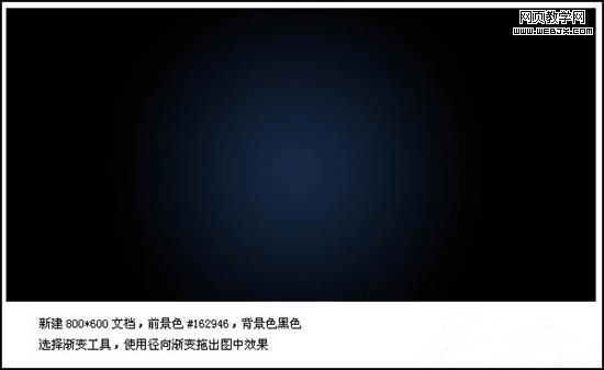 2、新建一個800 * 600像素文件,前景色設為:#162946,背景色設為黑色,選擇漸變工具拉出下圖所示徑向漸變。