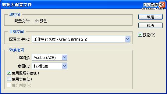 (編輯/轉換為配置文件,目標空間選gray gamma 2.2,點確定。lab模式直接轉換為灰度模式。)