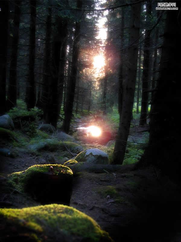 打開一個恐怖一些的圖片,然后放到樹的頂部透露陽光的地方,入下圖所示,我們給它添加蒙板,然后用柔角筆刷繪制只留臉部。