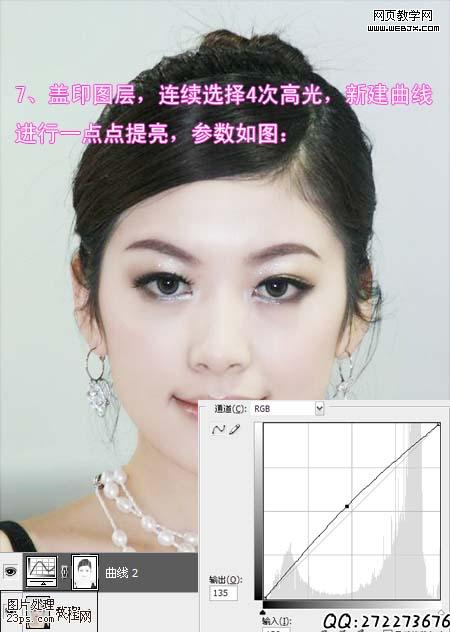 5、新建曲線調整層,對上一步的選區進行提亮,這時候看到mm的面部變亮了,而且臉上的小點點也基本沒有,呵呵!