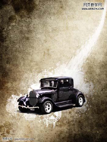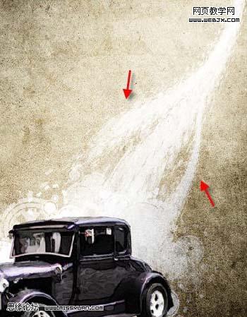 17、在背景副本圖層和汽車圖層之間,新建一個層,命名為污跡筆刷層,在污跡筆刷圖層,用下好的筆刷在汽車周圍隨意涂抹(改變筆刷的不透明度和流量制作出動感效果):