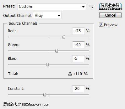 25、在云彩圖層上,選擇圖像-調整-通道混合器,參數設置如下圖所示: