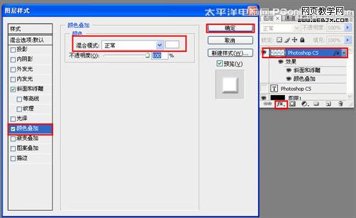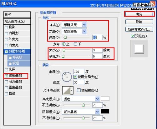 5、在圖層控制面板中,在英文字母還選中,點擊添加圖層樣式,彈出圖層樣式對話框,設置樣式為斜面和浮雕,樣式設置為浮雕效果,方法為雕刻清晰,深度為33%,大小為3像素,接著點擊添加圖層樣式,彈出圖層樣式對話框,設置樣式為顏色疊加,混合模式為正常,不透明度為100%,如圖6、7所示。效果如圖8所示。