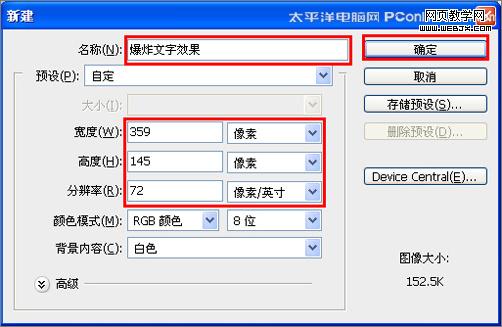 1、打開photoshop cs3軟件,執(zhí)行菜單:“文件”/“新建”(快捷鍵ctrl+n),彈出新建對話框,設置名稱:爆炸文字效果,寬度:359像素,高度:145像素,分辨率:72像素/英寸,顏色模式:rgb顏色、8位,背景內容:白色,設置完畢后單擊確定按鈕,如圖1所示。