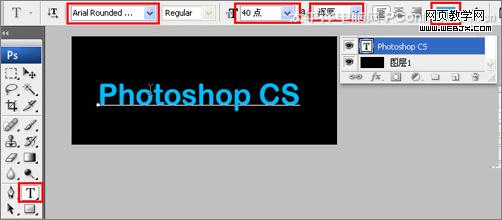 3、單擊工具箱中的橫排文字工具 ,輸入photoshop cs,然后按ctrl+t切換字符和段落面板,設置字體:arial roundend,大小:40點,顏色:藍色,設置消除鋸齒的方法:渾厚,如圖3所示。