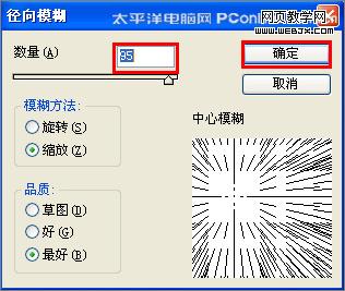 6、在圖層面板中,選擇英文字體,復制一個英文字體副本,然后選擇“濾鏡”/“模糊”/“向徑模糊”,彈出向徑模糊對話框,設置數量為95,模糊方法為縮放,品質為最好,如圖9所示。效果如圖10所示。