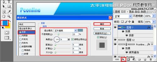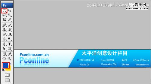 3、單擊工具箱中的橫排文字工具 ,輸入pconline,然后按ctrl+t切換字符和段落面板,設置字體:方正綜藝簡體,大小:40點,顏色:藍色,設置消除鋸齒的方法:渾厚,如圖4所示。