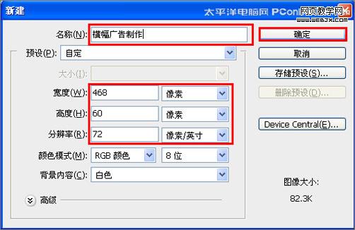 1、打開photoshop cs3軟件,執行菜單:“文件”/“新建”(快捷鍵ctrl+n),彈出新建對話框,設置名稱:橫幅廣告制作,寬度:468像素,高度:60像素,分辨率:72像素/英寸,顏色模式:rgb顏色、8位,背景內容:白色,設置完畢后單擊確定按鈕,如圖1所示。