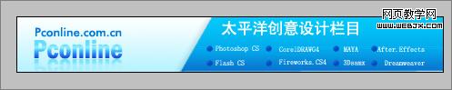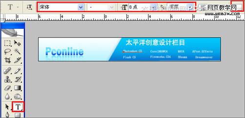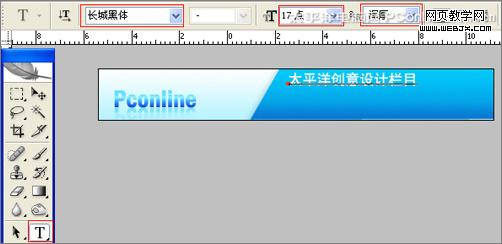 8、在工具箱中選擇橫排文字工具,在工作區中用鼠標單擊后,輸入“太平洋創意設計欄目”,在工具選項欄中設置字體為“長城黑體”,設置字體大小為17點,設置消除鋸齒為“渾厚”設置字體顏色為白色,如圖10所示。