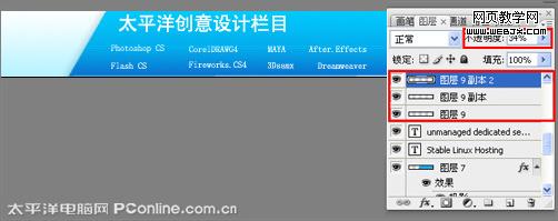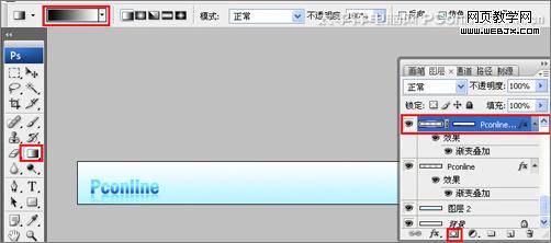 5、在圖層控制面板中選擇pconline圖層,按住alt不放,用鼠標左鍵拖動出pconline副本圖層,按快捷鍵ctrl+t,將副本圖層進行倒立,接著給pconline副本圖層添加一個蒙板,點擊漸變工具,給pconline副本圖層添加漸變,如圖7所示。