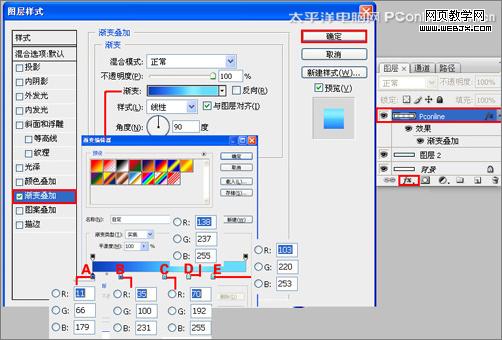 4、選擇pconline圖層,右擊pconline圖層,選擇混合選項,進入到圖層樣式,勾選漸變疊加選項,雙擊漸變彈出漸變編輯器,雙擊如圖的a處,設置色彩rgb分別為11、66、179,再雙擊圖中所示的b處,設置色彩rgb分別為35、100、231,再雙擊圖中所示的c處,設置色彩rgb分別為70、192、255,再雙擊圖中所示的d處,設置色彩rgb分別為138、237、255,再雙擊圖中所示的e處,設置色彩rgb分別為103、220、253,單擊確定按鈕,接著按鍵盤shift不放結合鼠標從上到下拉下,給漸變效果,如圖5所示。效果圖如圖6所示。
