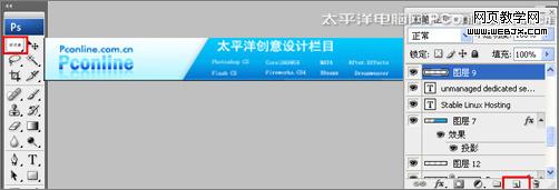 13、在圖層控制面板中選擇按鈕圖層,按住alt不放,用鼠標左鍵拖動出7個按鈕副本圖層,并調整距離和位置,調整后的效果圖,如圖15所示。也是最終效果圖。