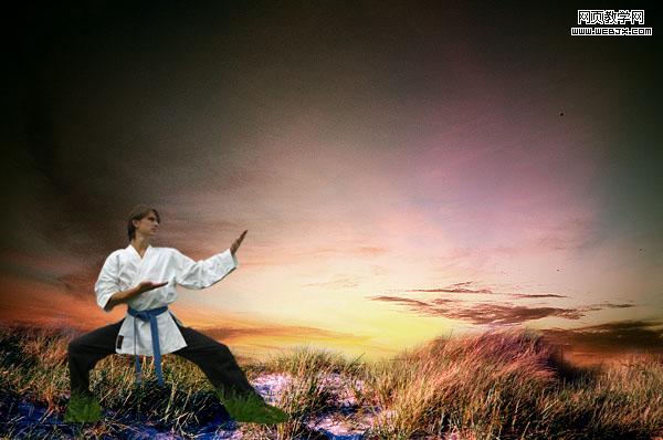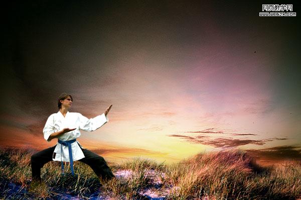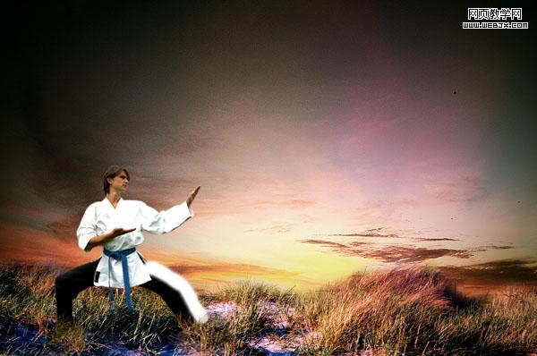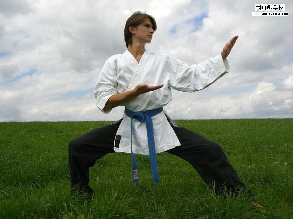現(xiàn)在我們的主要背景制作好了,拼合所有圖層當作背景。然后打開一個練武的人物照片。之后我們用摳圖方法摳出人物,這里大家可以參考網(wǎng)頁設計的photoshop摳圖教程專題。