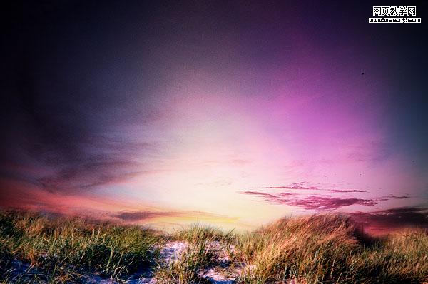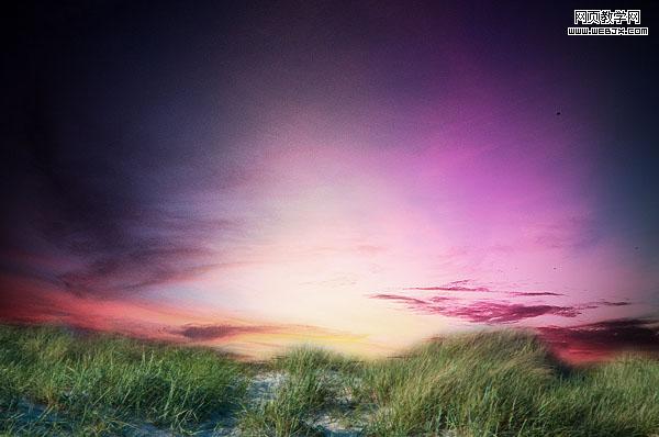 創(chuàng)建一個新圖層sky gradient overlay,然后設置漸變效果,填充畫布,然后降低圖層透明度到50%,改變圖層模式為疊加,效果如下。