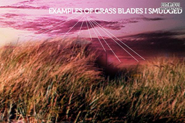 為了使兩種效果更加融合,選擇人物腳部的草,然后復制,新建一個圖層,粘貼過來,然后我們用一個小的柔的畫筆涂抹新圖層的草,使用1px的涂抹工具降低草的透明度,最終使圖像完全融合在一起。