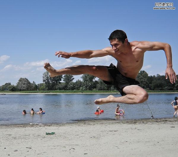 我們找到一幅跳起的人物的照片,然后扣取出來,調(diào)整大小旋轉,放到合適的位置。