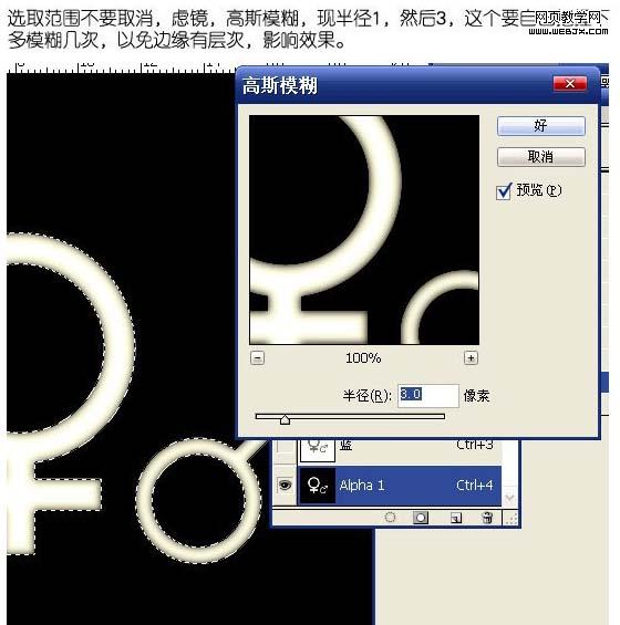 5、保持選區(qū)不變,點新建的通道,執(zhí)行:濾鏡 > 模糊 > 高斯模糊,數(shù)值為1,確定后再執(zhí)行一次模糊操作,數(shù)值為3,這個要自己把握下,多次模糊幾次以免邊緣有層次,影響效果。 |