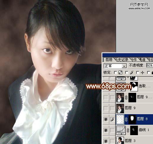6、按ctrl + alt + ~ 調(diào)出高光選區(qū),新建一個圖層填充白色,把圖層不透明度改為:60%,加上圖層蒙版只保留人物臉部及皮膚部分,其它地方用黑色畫筆擦掉,如圖8。