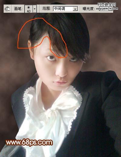 7、新建一個圖層,蓋印圖層,選擇加深工具,曝光度為:10%,把圖9紅圈位置頭發(fā)部分加深一點,效果如圖10。